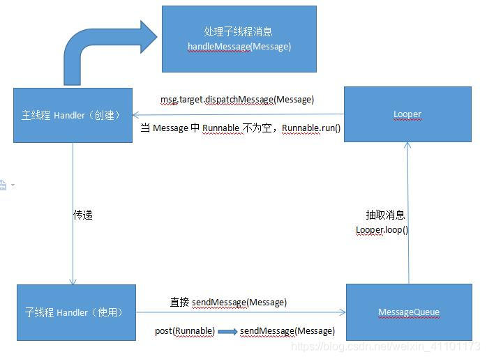 ⑥调用Handler的post方法会将一个Runnable投递到Handler内部的Looper中去处理,也可以通过Handler的send方法来发送一个消息,这个消息同样会在Looper中去处理。其实post方法最终也是通过send方法来完成的。每当Looper发现有新消息到来时,就会处理这个消息,最终消息中的Runnable的run方法或者Handler的handleMessage方法就会被调用。注意Looper是运行在创建Handler所在的线程中的,这样一来Handler中的业务逻辑就被切换到创建Handler所在的线程中去执行了;