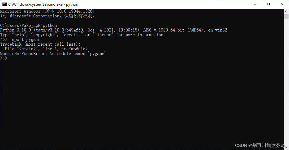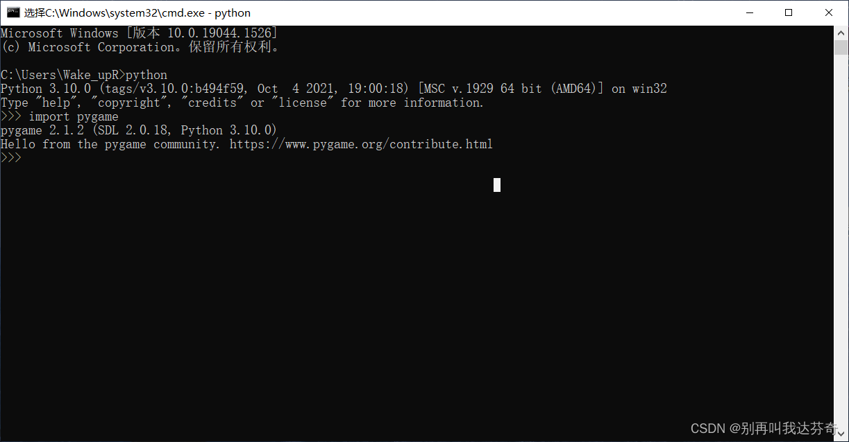 分别在cmd(按住Win r 左下角弹窗输入cmd点确定)中输入以下两行命令检测是否安装了pygame