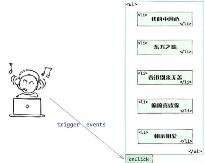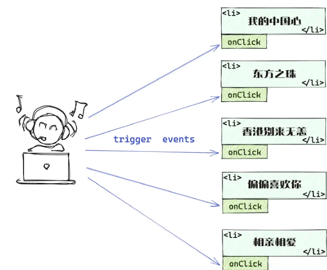 每个 li都有自己的事件处理机制,但不管是哪个li,其实都是ul的成员,这样可以将li的事件委托给父级节点 ul,让ul成为这些li的事件代理。