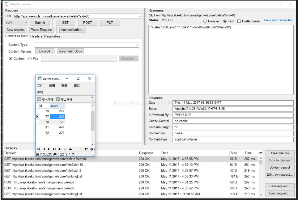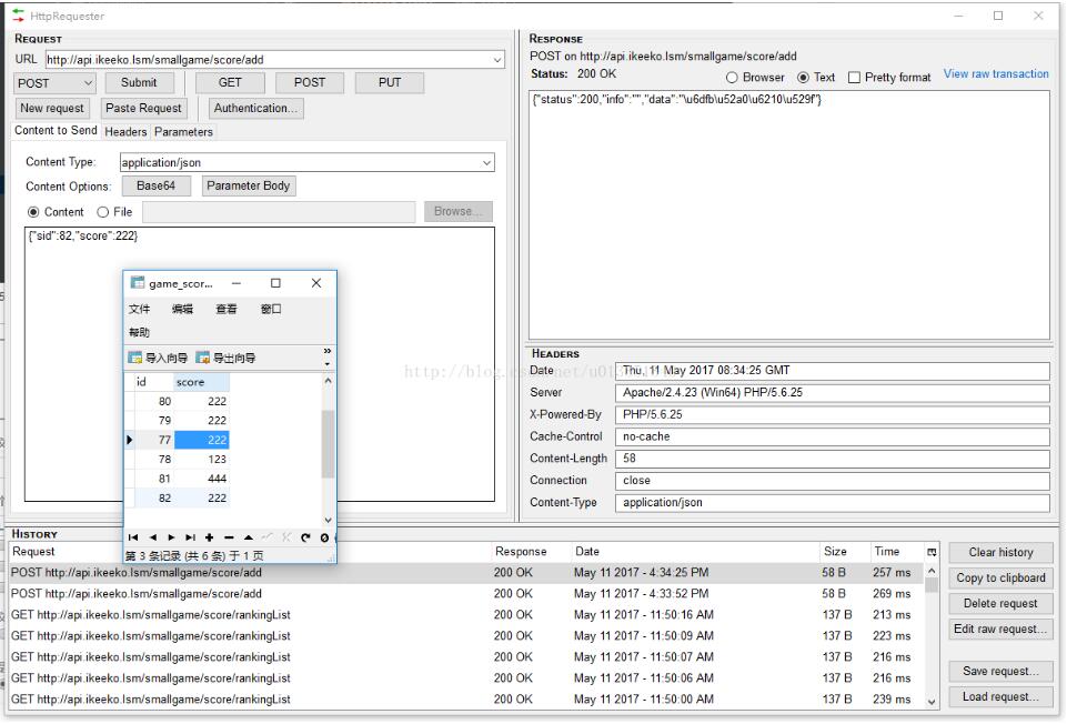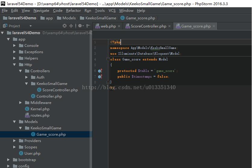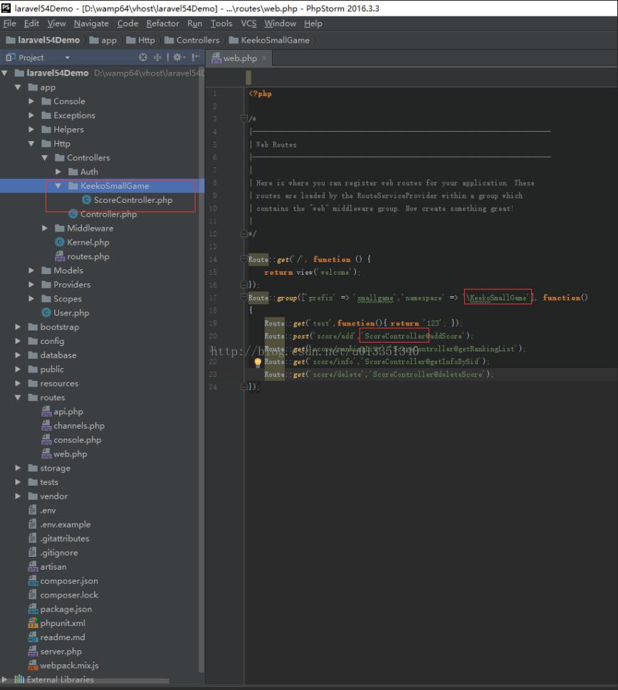 2.路由配置,'namespace' => '\KeekoSmallGame'此命名空间对应的路径为App\Http\Controllers\KeekoSmallGame,Route::post('score/add','ScoreController@addScore'); post为请求方式,score/add为访问路径,ScoreController为指定控制器名,addScore为该控制里的方法。