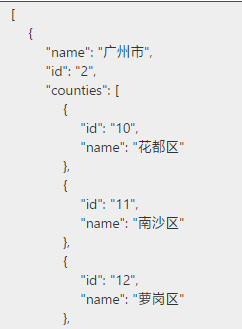 第一眼就看到了这三个下拉框,按捺不住好奇心的我点了点。原来,第一个下拉框可以选择市属和省属,如果选择市属,那么后面就会出现市、县级两个下拉框,如果是省属,那就隐藏了,这个挺容易的。然后就是要选择市之后,区下拉框要有对应区县选项。emmmm,很典型的二级联动,不过既然分析完了思路,那就开始做吧!首先呢,数据肯定要从后端同事那里拿,调用他的接口把数据填充进去。看看数据是什么样子的: