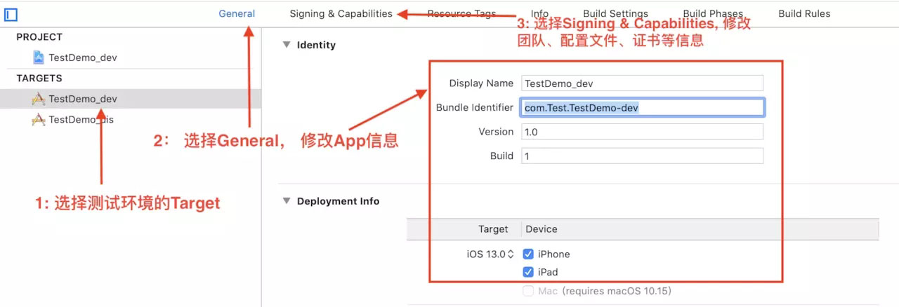 (1)更改测试环境下的General 和 Signing & Capabilities 中的信息
