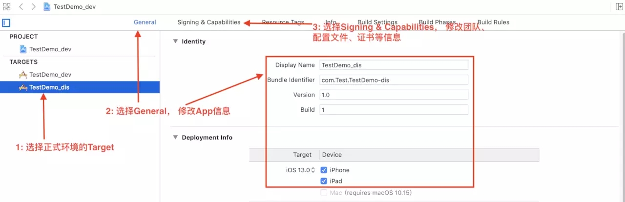 (2)更改正式环境下的General 和 Signing & Capabilities中的信息
