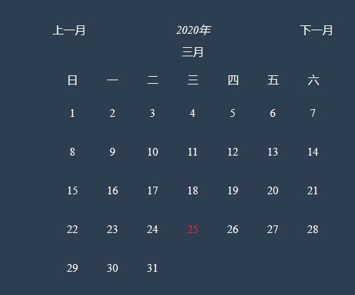 实现思路:获取每个月的第一天是星期几,然后把前面的天数填充为空,在获取每个月有多少天,循环填充,判断并给给当前时间添加单独样式,点击上一月,和下一月时改变月份。