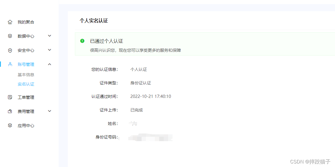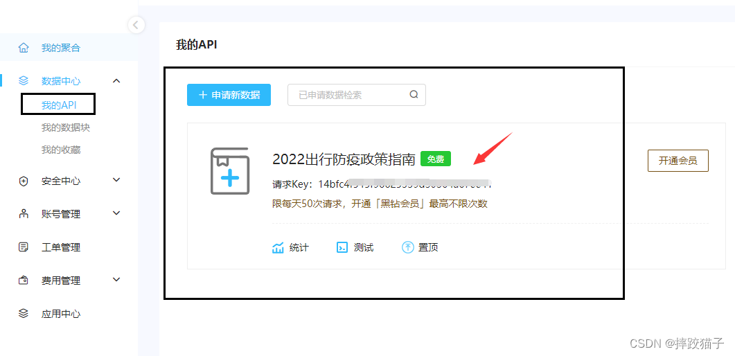 访问聚合数据,创建/登录账号,点击个人中心,填写对应的资料进行实名认证并申请对应的接口权限。