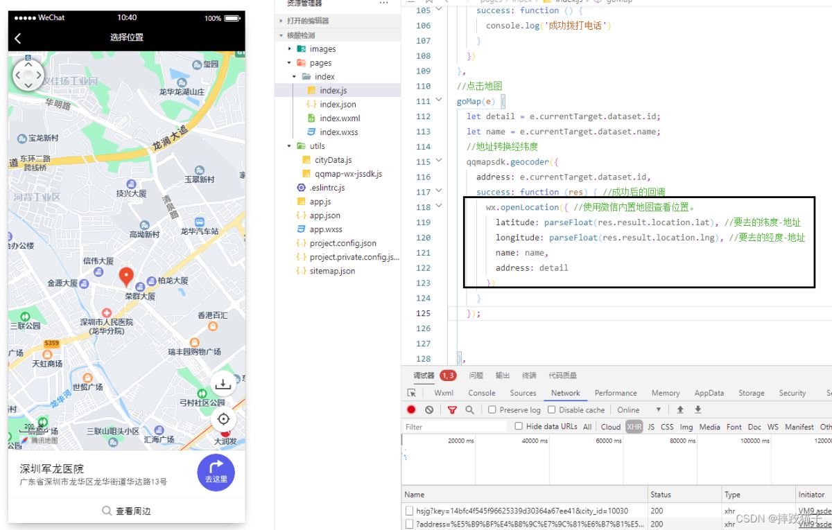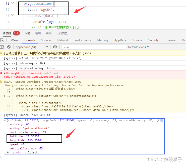 - 回到index.js,在onLoad函数中调用wx.getLocation,这个函数是用于获取用户当前经纬度。