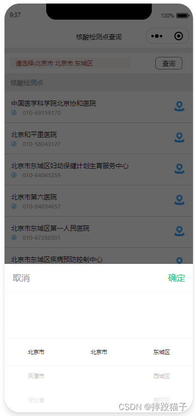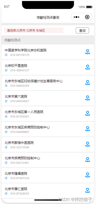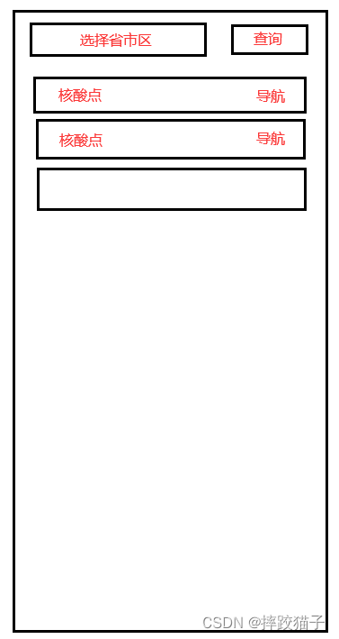 在页面上大致要实现选择省市区功能,然后通过点击查询按钮将核酸点数据进行渲染,实现导航及拨号等细节功能,设计如下。