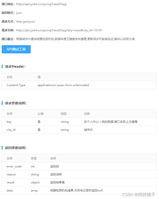 可以看到调用该接口的参数很简单,只有用户应用key以及city_id,也就是我们上面所封装的省市区js里面的数据。