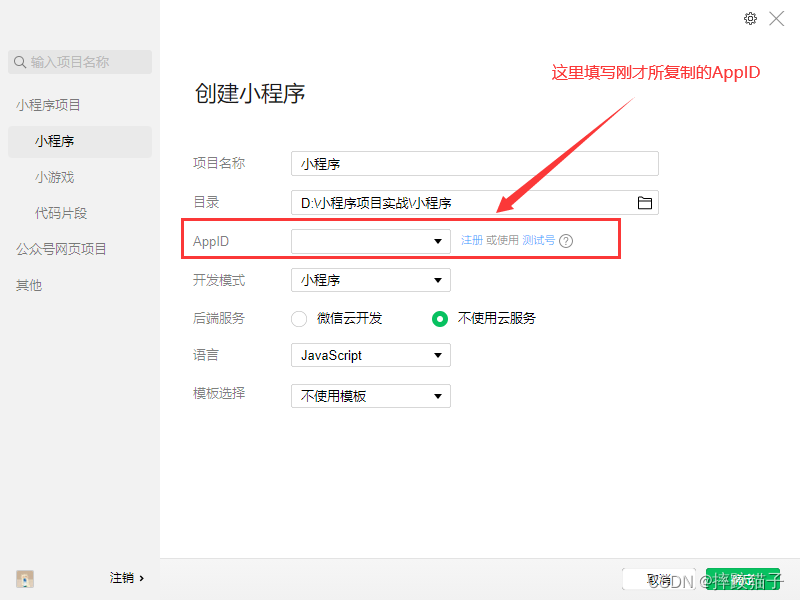 - 下载安装微信web开发者工具并创建一个新的项目,填入上图所复制的AppId。