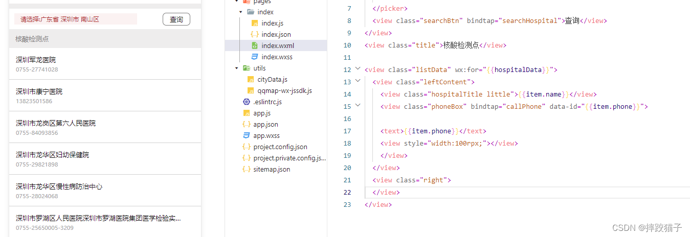 - 在页面上定义对应的view及wx:for,将核酸检查点名称及电话进行展示。