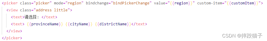 - 实现省市区下拉框三级联动,这里需要用到的是picker组件,mode熟悉填写region。