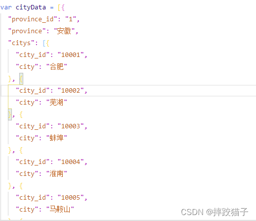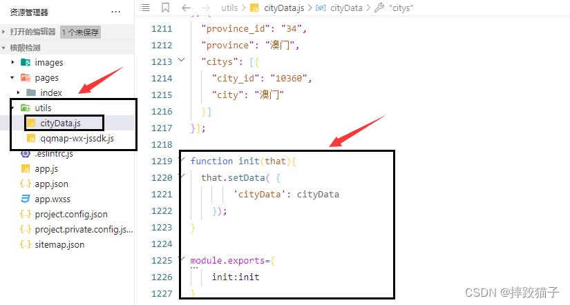 后续的接口请求中需要传递不同的城市code,所以现在现在需要封装一个JS,用于传参使用。在utils文件夹中新建一个js文件,将省份及城市数据存放其中,并进行初始化。