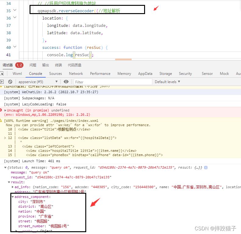 - 很显然,经纬度是不能够直接赋值给picker组件的,接下来需要逆解析将其转换为地址,这时候需要用到reverseGeocoder函数了,将上一个函数返回的经纬度作为参数拼接调用,返回的信息中就有我们需要的省市区等详细地址了。