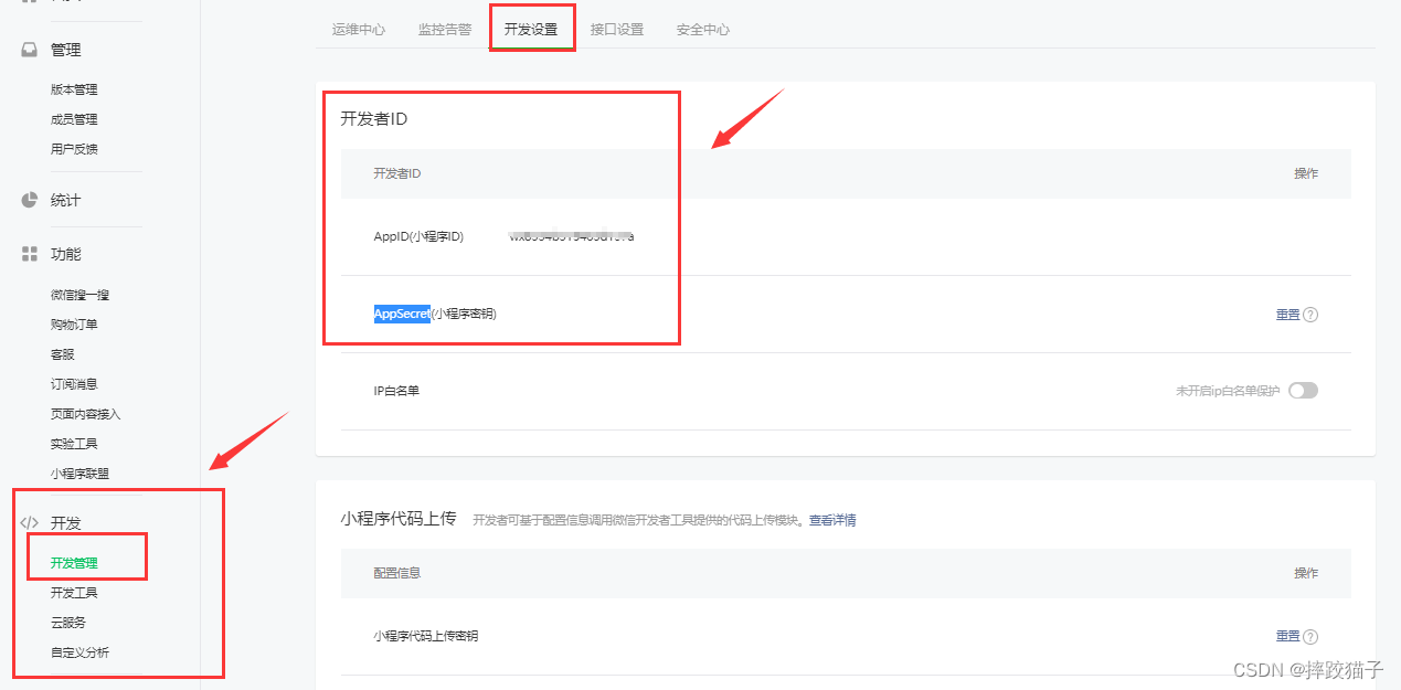 - 在开发管理选择开发设置,将AppID及AppSecret复制出来进行存储。