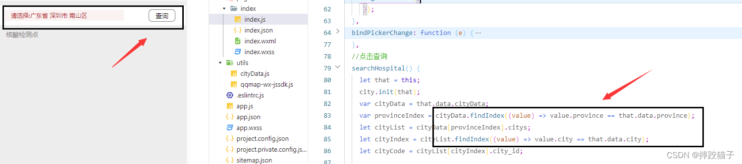 - 因为picker组件所响应的值是某某省、某某市这样的数据,而我们所封装的JS数据中又是没有省跟市这些后缀的,所以在选择的时候需要将省市区进行最后一位的移除,然后再通过findIndex的方式找到对应的下标,通过下标再找到对应的city_id。