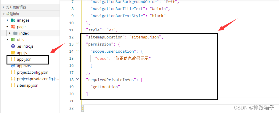 - picker组件在加载时候默认是不会选中的,为了优化用户体验,我们需要在加载的时候获取用户的位置并对其进行赋值,首先需要在app.json文件中增加配置。