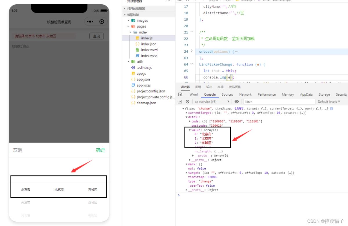 - 同时实现该组件的响应函数,看是否能够获取到我们所需要的信息,正确响应如下图,然后根据数组下标取到对应的省市区并将其存储到全局的data中。