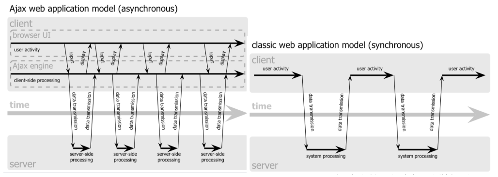 第一张图尤其说明了传统Web 应用程序的结构与采用了 AJAX 技术的 Web应用程序的结构上的差别