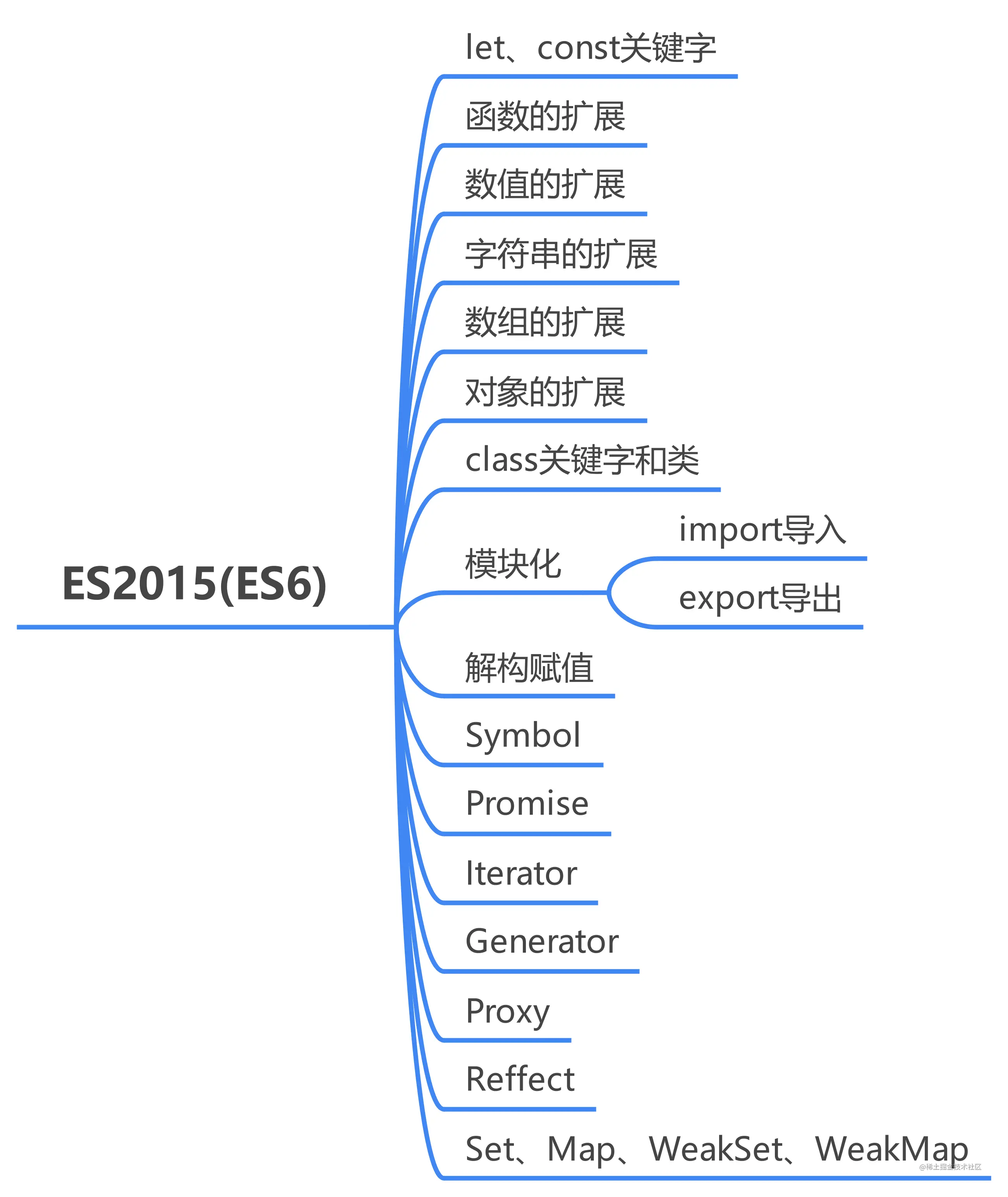 ES2015是改动最大的一个版本,基本上对ES2015之前的所有的内容都做了扩展,大体如下图所示: