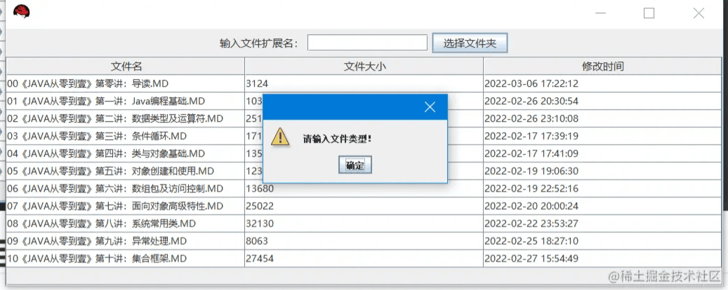 有一个“选择文件夹”按钮,点击后,程序会先判断输入的文件扩展名是否为空,如果为空,提示:请输入文件类型。如果不为空,用输入的文件扩展名过滤用户选择的文件夹里的文件,并显示在界面上。