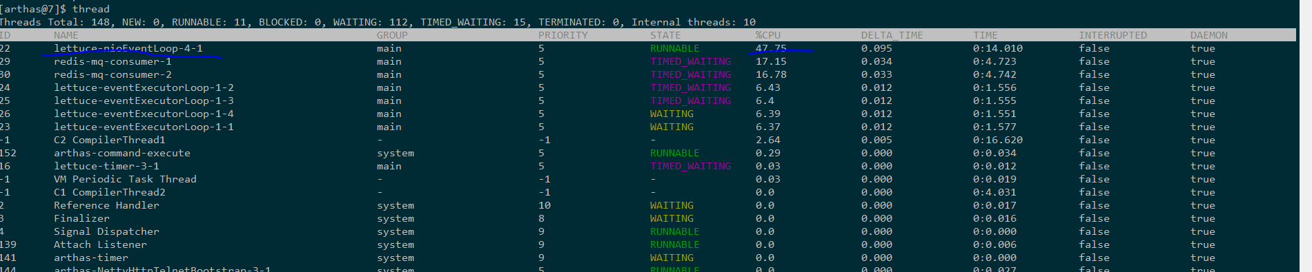 可以看到当前线程lettuce-nioEventLoop-4-1 占用cpu高达47.75。其实这个线程名称已经能定位到具体某个方向的问题了,所以线程名称的定义需要有意义 为了方便排查问题。