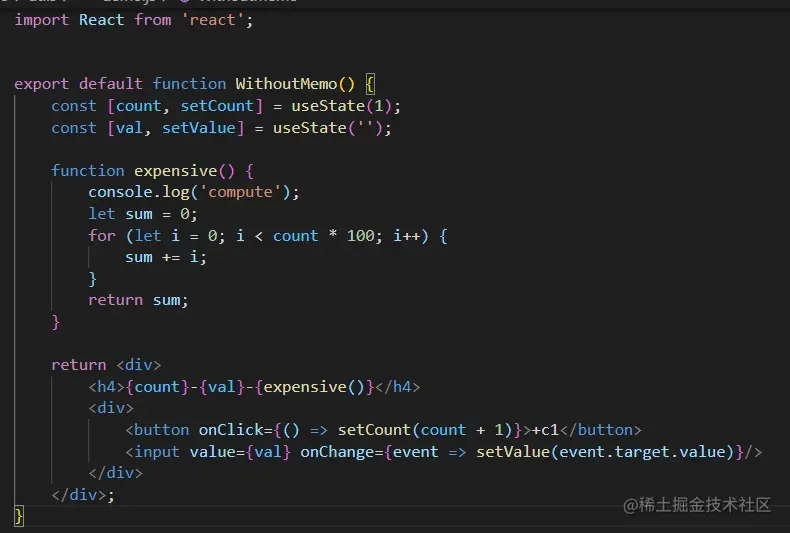 这里创建了两个state,然后通过expensive函数,执行一次昂贵的计算,拿到count对应的某个值。我们可以看到:无论是修改count还是val,由于组件的重新渲染,都会触发expensive的执行(能够在控制台看到,即使修改val,也会打印);