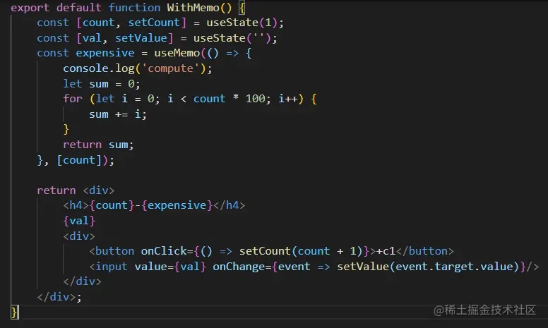 但是这里的昂贵计算只依赖于count的值,在val修改的时候,是没有必要再次计算的。在这种情况下,我们就可以使用useMemo,只在count的值修改时,执行expensive计算: