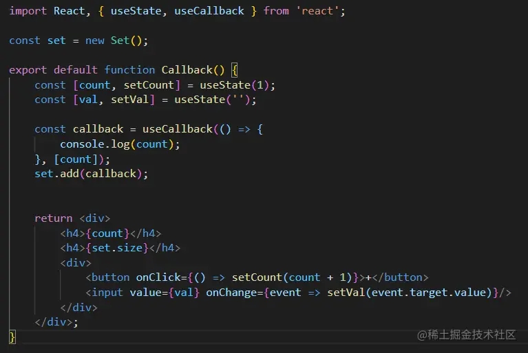我们可以看到,每次修改count,set.size就会 1,这说明useCallback依赖变量count,count变更时会返回新的函数;而val变更时,set.size不会变,说明返回的是缓存的旧版本函数。
