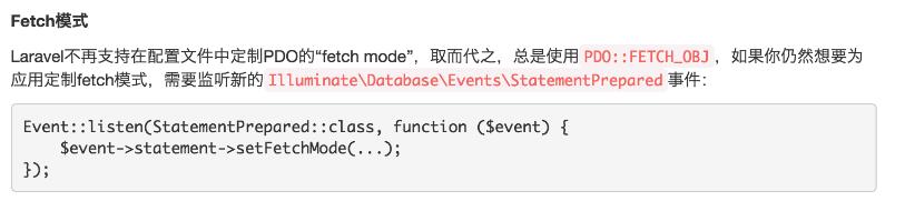 如上图所示:Laravel不再支持在配置文件中定制PDO的“fetch mode”,取而代之,总是使用PDO::FETCH_OBJ,如果你仍然想要为应用定制fetch模式,需要监听新的Illuminate\Database\Events\StatementPrepared事件。