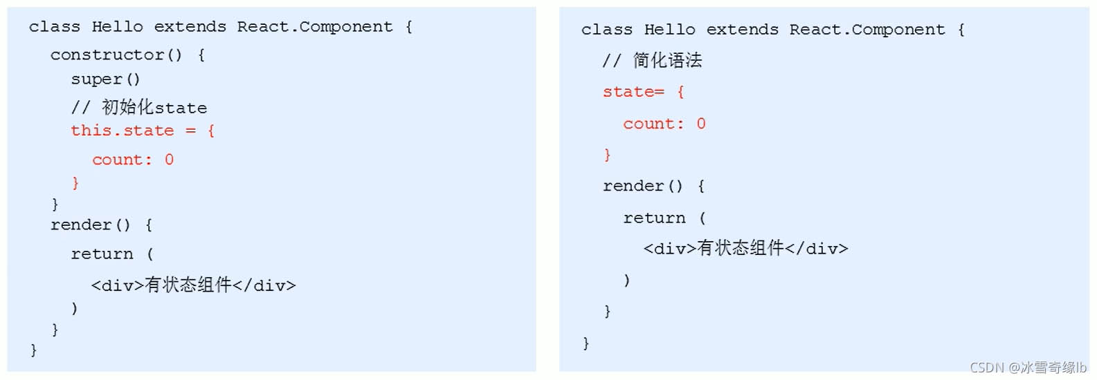 比如计数器案例中,点击按钮让数值加1。0和1就是不同时刻的状态,而由0变为1就表示状态发生了变化。状态变化后,UI也要相应的更新。React中想要实现该功能,就要使用有状态组件来完成。
