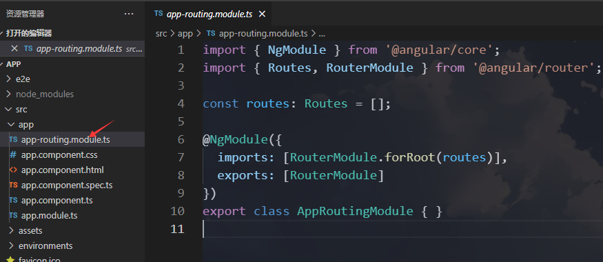 angular项目使用ng指令创建的时候,设定有一个默认路由。位置如下图:
