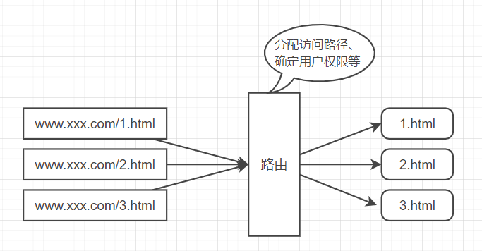 也就是在用户和网页之间再加一道关卡,由这道关卡负责校验用户权限、确定具体访问哪个页面等。这就是路由的主要作用。