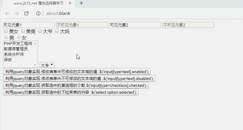 //<input id="btn0" type="button" value="利用jquery对象实现 修改表单中可见的文本域的值 $('input[type=text]:enabled')" />