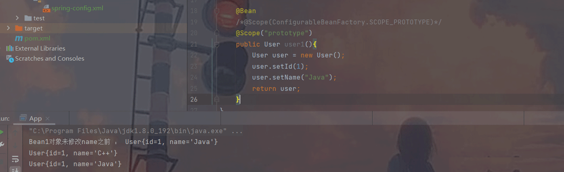 回到刚才的案例,Bean2希望获取到的bean对象是未被修改的,我们就可以将单例模式修改为多例模式。
