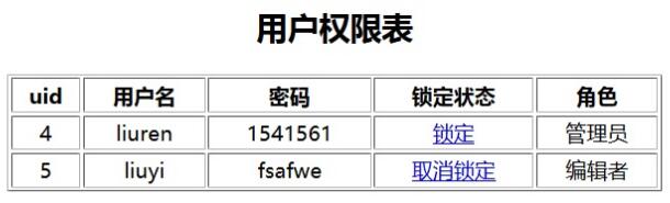 <th>uid</th><th>用户名</th><th>密码</th><th>锁定状态</th><th>角色</th>