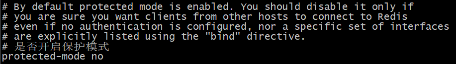 这里原来是yes代表开启了保护模式,后面可以填密码也可以填no代表关闭,我们这里选择关闭保护模式,wq保存退出后再重启redis-server