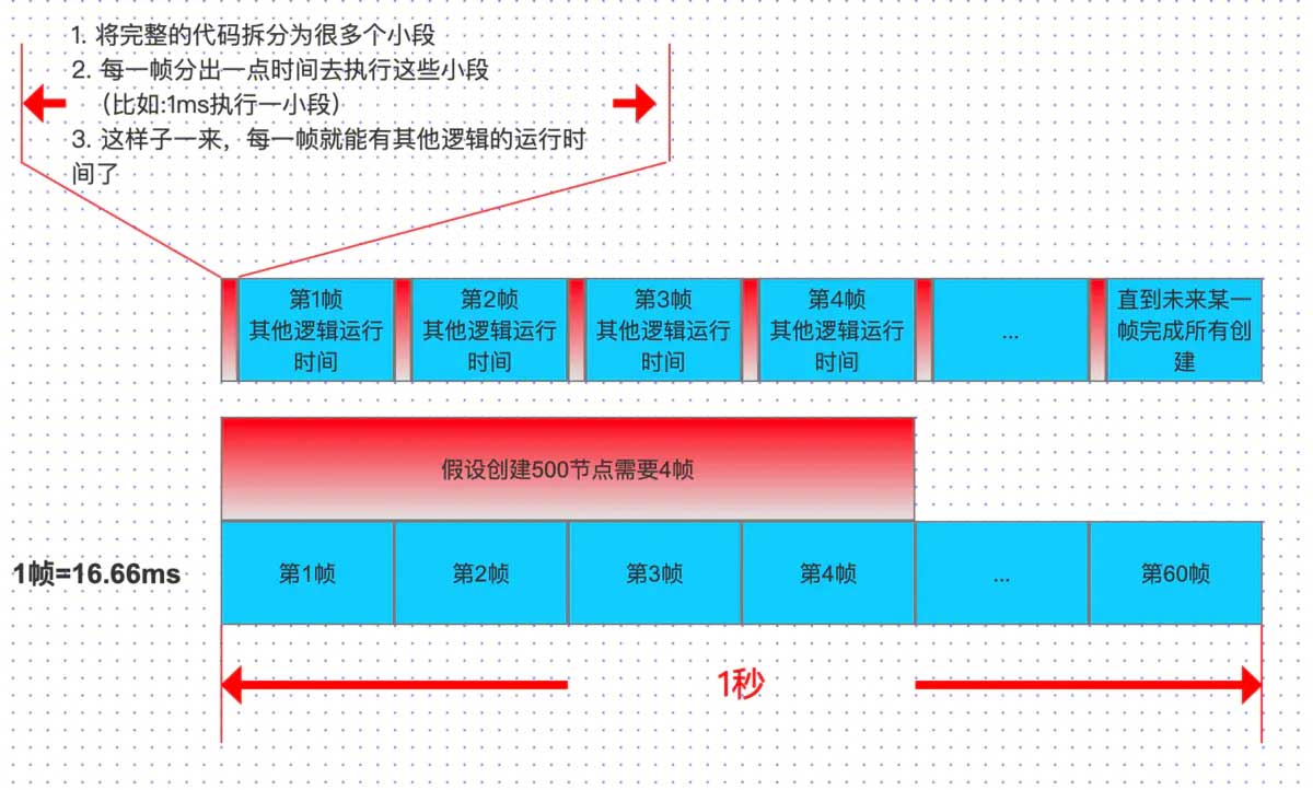 这里的原理就是 利用 Generator 将一次 for 循环里创建所有节点,改为拆分 for 循环的每一步为一个小段