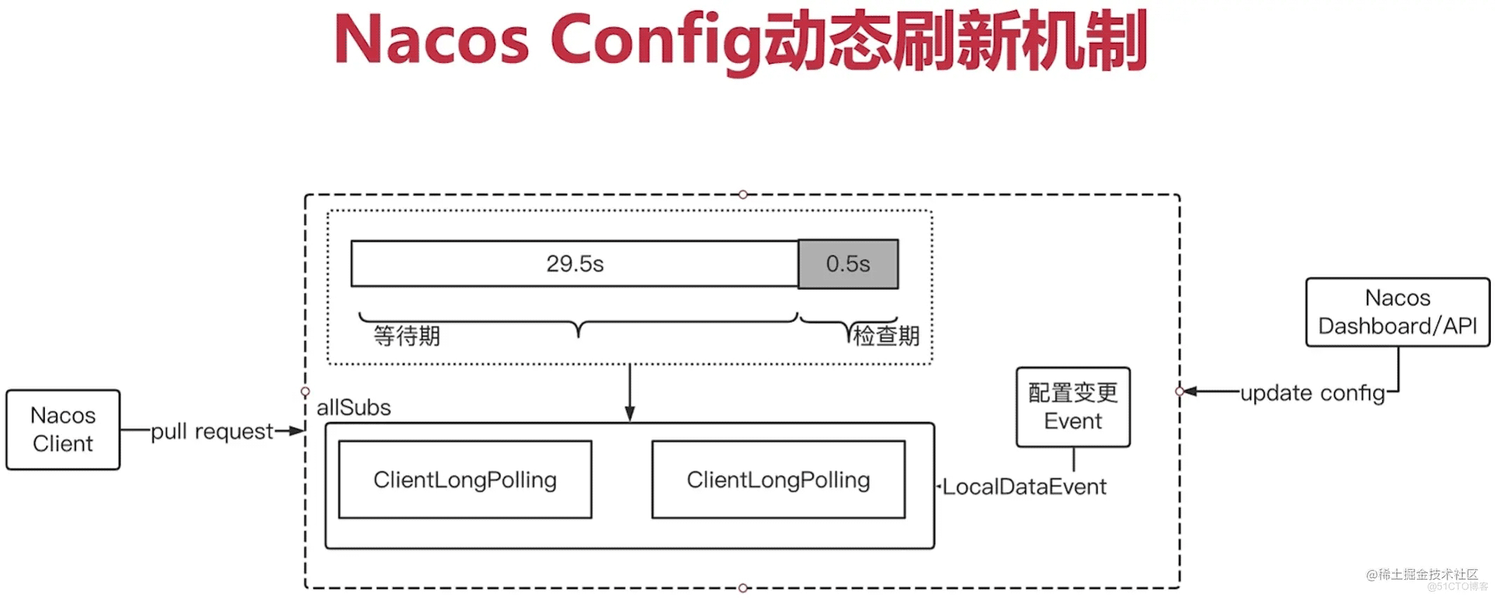 - 长轮询也是轮询,因此 Nacos 客户端会默认每10ms向服务端发起请求,当客户端请求服务端时会在请求头上携带长轮询的超时时间,默认是30s。而服务端接收到该请求时会hang住请求,为了防止客户端超时会在请求头携带的超时时间上减去500ms,因此默认会hang住请求29.5s。