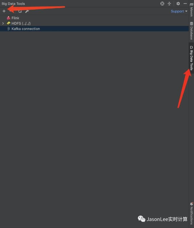 先点击 IDEA 右侧的 Big Data Tools,然后点击加号就可以添加 Flink 组件了。