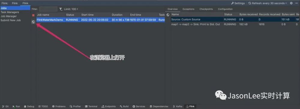 这样就可以直接在 IDEA 里面查看 Flink Dashboard,跟在 Web UI 上的功能完全一样,点击箭头所指的地方可以直接跳转到 Flink UI,虽然可以直接在 IDEA 里面查看 Dashboard,但是个人感觉还是在 Flink Web UI 上查看更加方便,可能是看习惯了。不是太推荐这个功能。