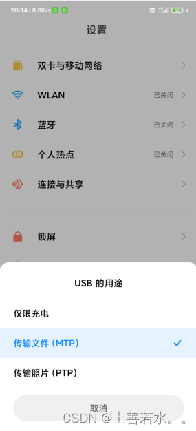 3)使用USB数据线将电脑与手机连接起来,连接后在手机中选择连接USB的用途为“传输文件”。