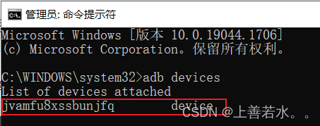 5)在cmd中输入以下命令,表示查看adb所连接的设备:
