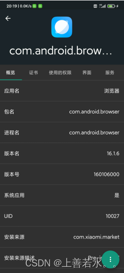 6)在手机上通过第三方软件(比如APK查看器等)查看你要卸载的软件的包名。比如这里我要卸载系统自带的浏览器,可以看到它的包名是com.android.browser