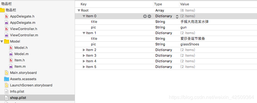 3、模型准备好了,下面在viewController类里面写一个方法将plist文件数据读取出来封装到item对象里面,再用item对象初始化model对象,将所有model对象存入可变数组(_allItems)里面: