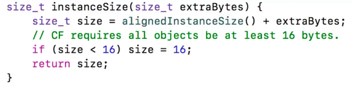 如果查看开源的代码,从这个 allocWithZone 开始查找 calloc 的过程,最终会查到上面图片中返回内存地址大小的函数。由此可知,在 Objective-C 中的对象在真正分配内存空间的时候至少是16个字节。像 NSObject 或者继承于 NSObject 的子类而没有添加任何成员属性的 Class 对象都是这样的、有多余在8个字节的空间没有被用于成员变量,可能用于其他地方。