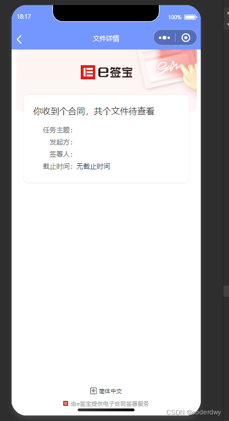 本以为业务域名配置好了,地址也发过来了,微信里面是可以打开的并且电子合同信息都完全显示、签字盖章的,但是在微信小程序里面打开却只是个静态页面,很无语,截图如下