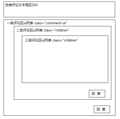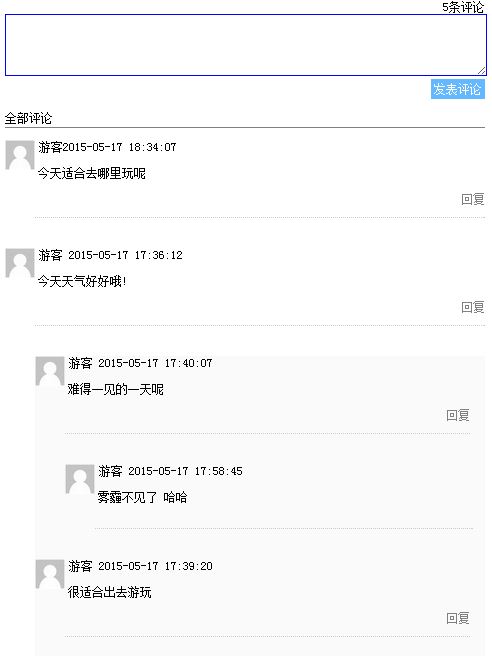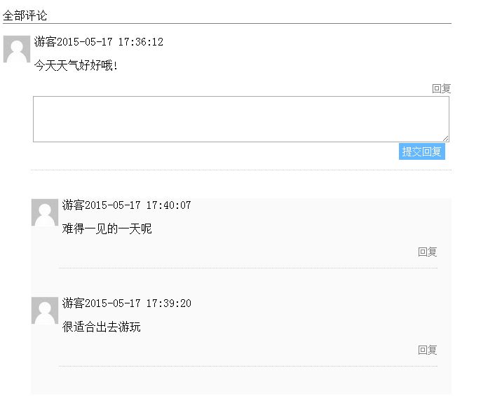 2.对发表的评论可以回复,回复显示在上级评论下边,形成层级关系,如下效果图