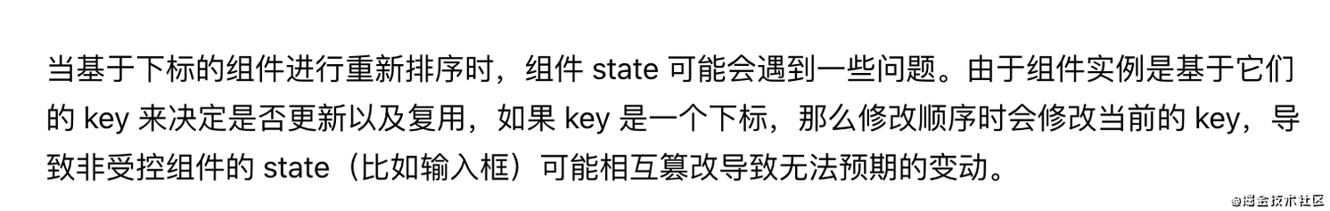 在这个例子中,通过将key设置成index,span的颜色有了变化,但是在使用key时,React官网不推荐使用index