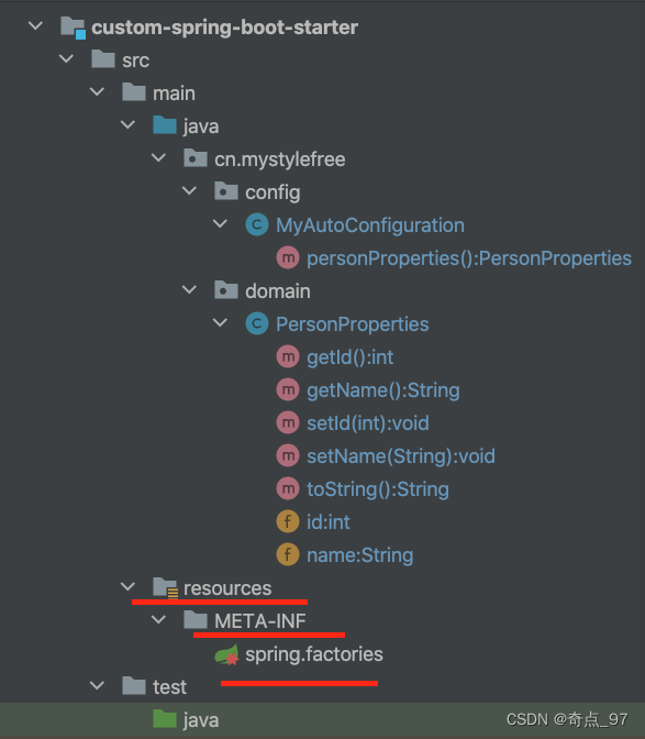 注意:META-INF是自己手动创建的目录,spring.factories也是自己手动创建的文件,在该文件中配置自己的自动配置类。