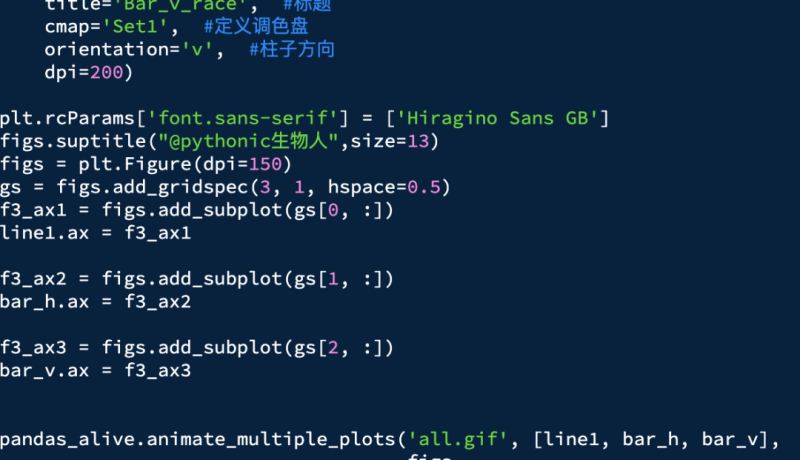 这部分可以结合matplotlib的多子图绘制,实现各种个性化动图,可参考matplotlib-多子图绘制(为所欲为版),核心代码如下,